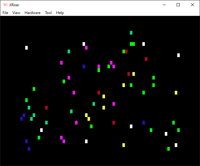 Because of this “all pixels must be the same color” effect of the SET command, doing a random pixel plotting program…